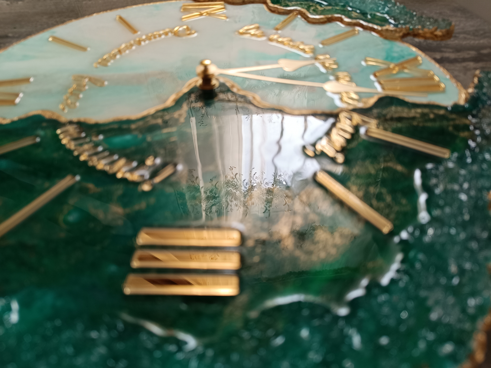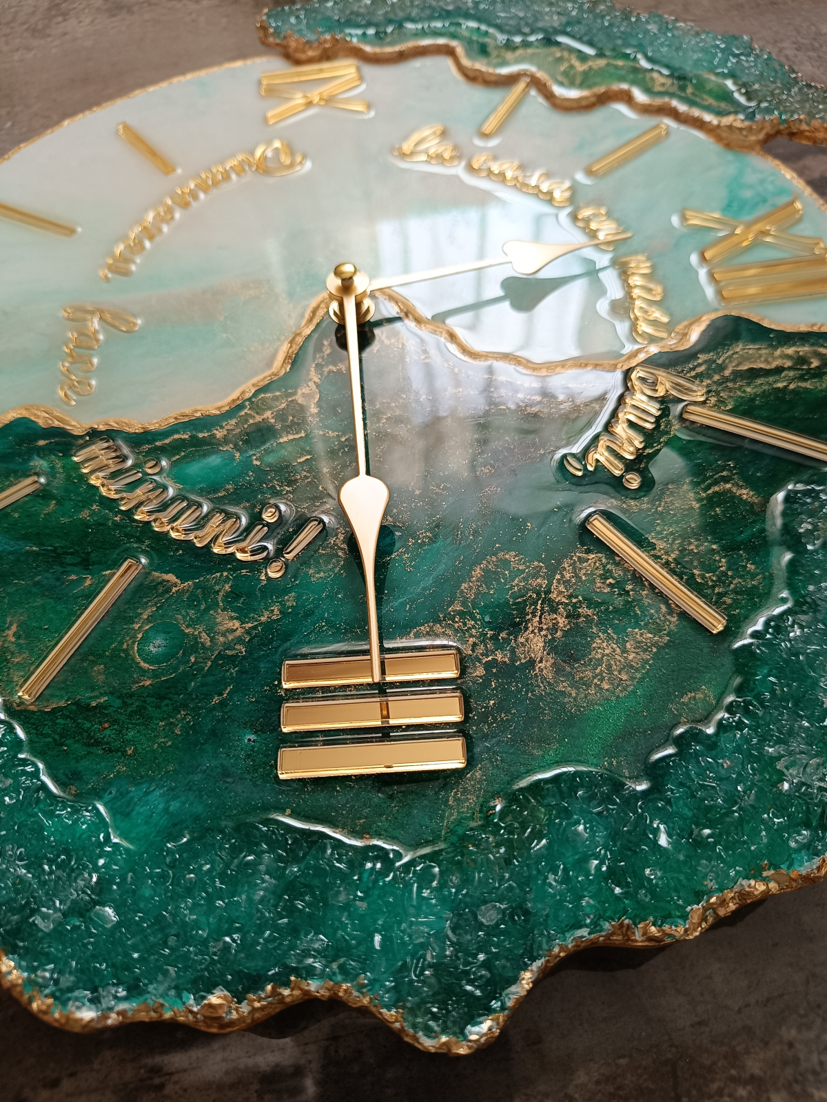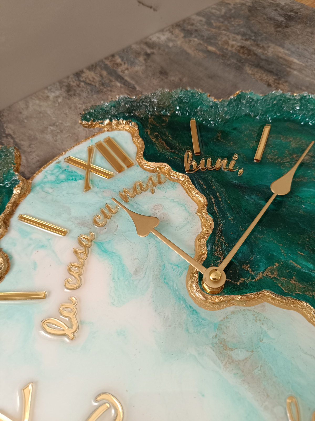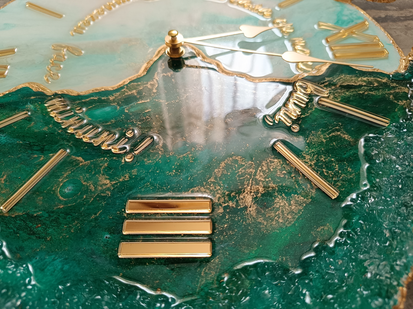 Ceas decorativ de perete, handmade din rășină epoxidică, model unicat cu design asimetric. Tonurile de verde smarald și accente aurii adaugă un plus de stil în orice interior – modern, minimalist sau elegant.