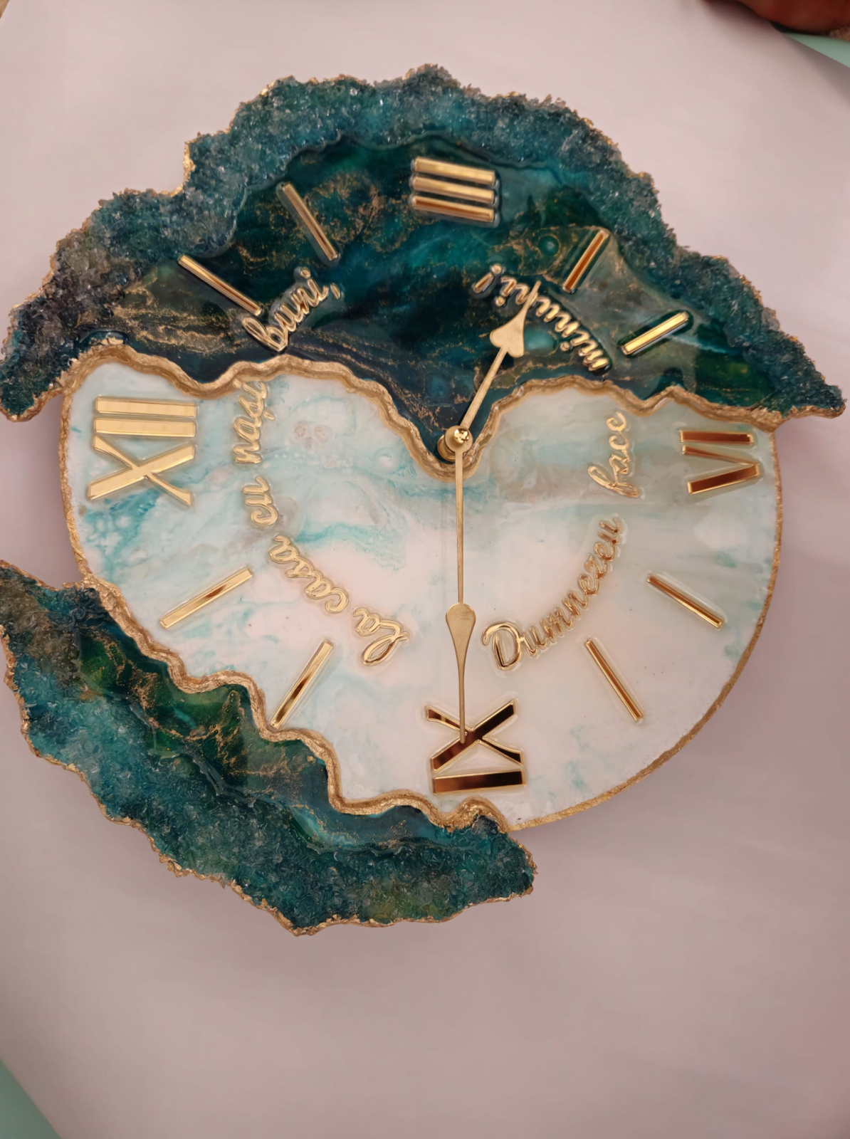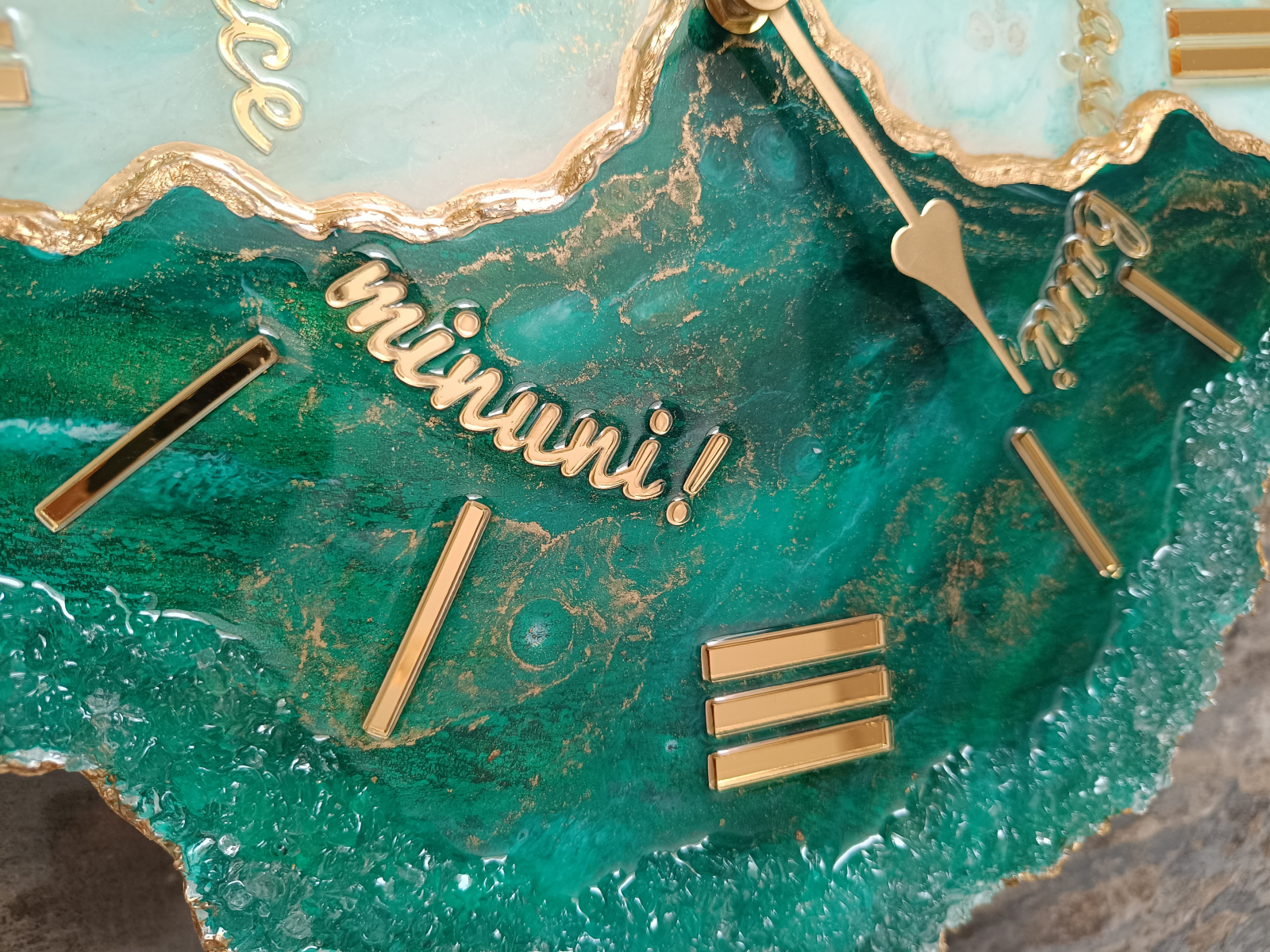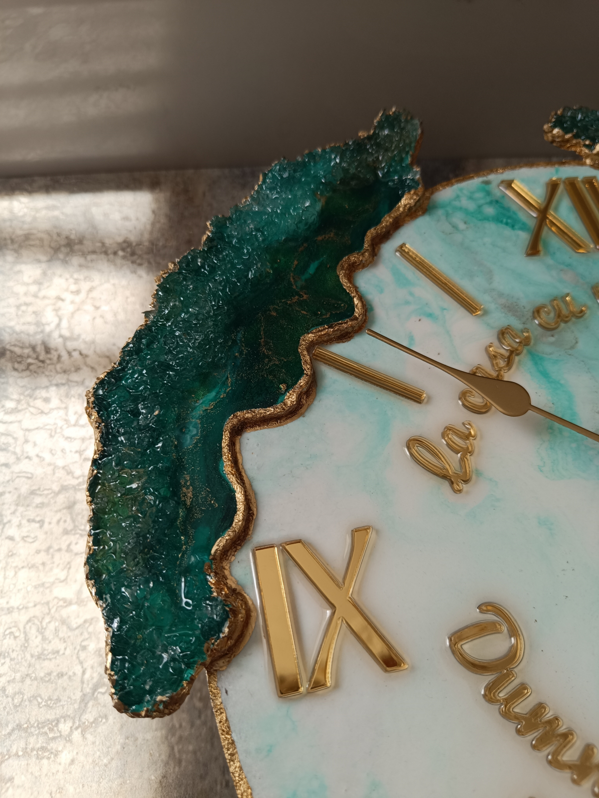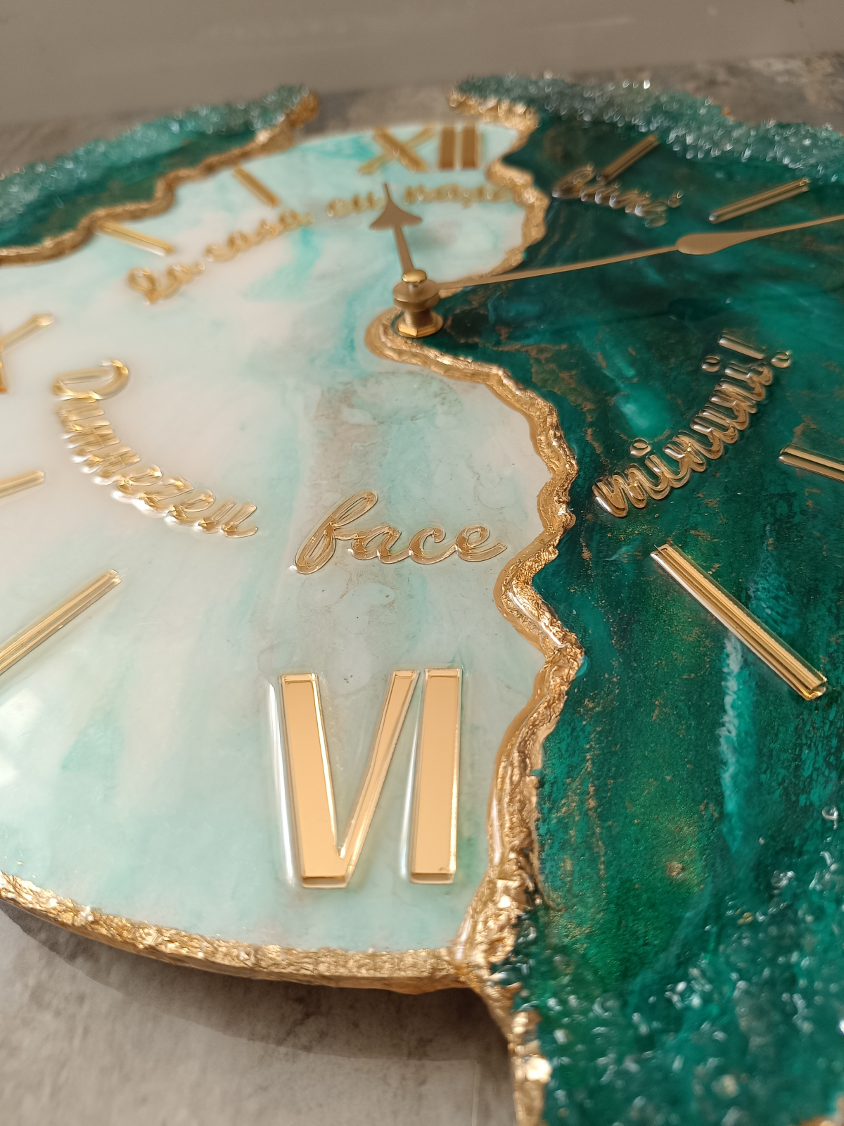 Ceas decorativ de perete, handmade din rășină epoxidică, model unicat cu design asimetric. Tonurile de verde smarald și accente aurii adaugă un plus de stil în orice interior – modern, minimalist sau elegant.