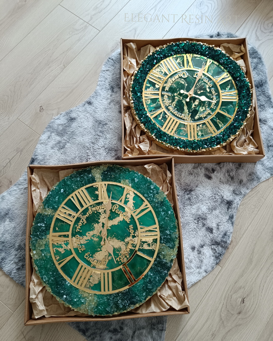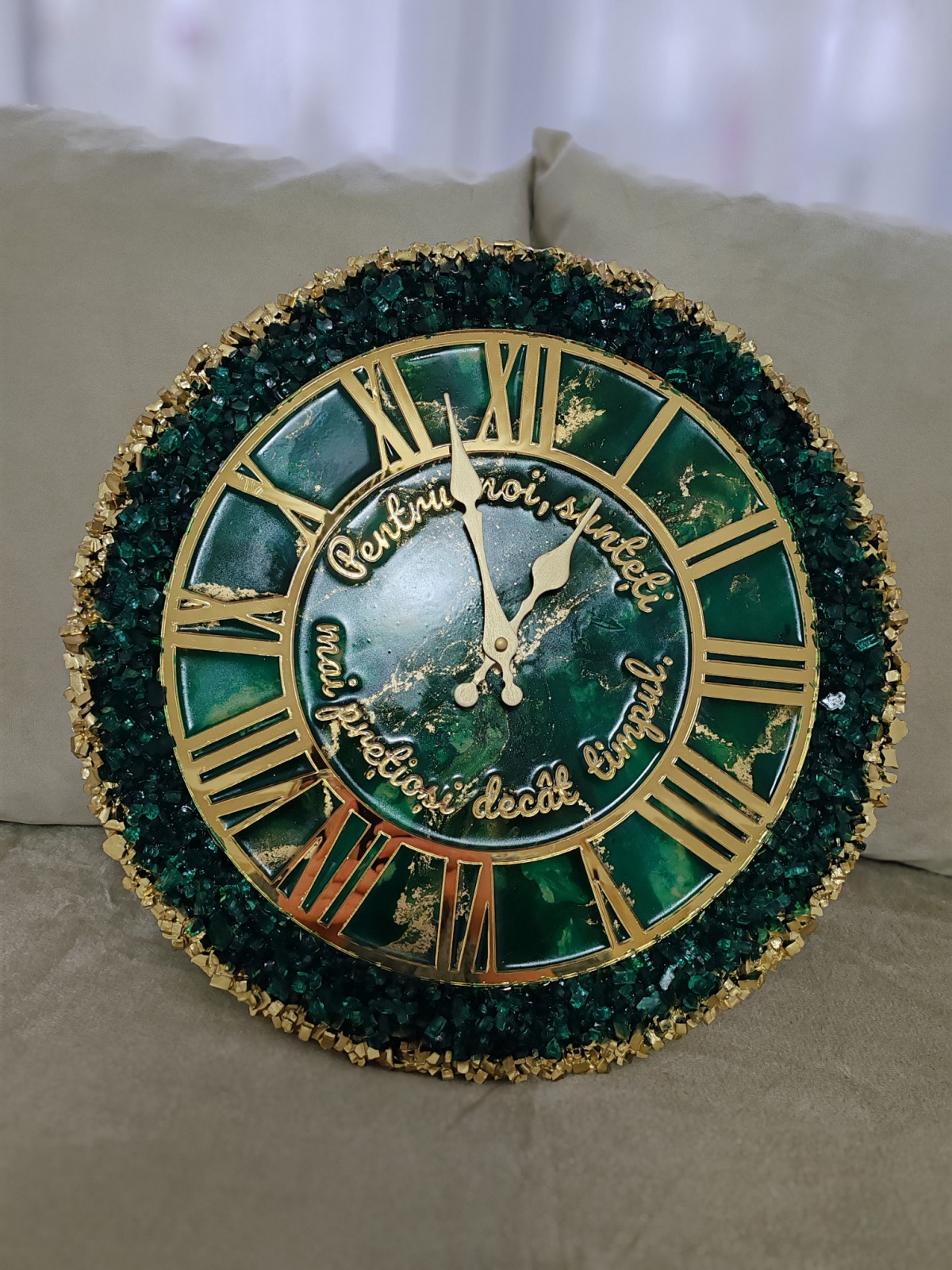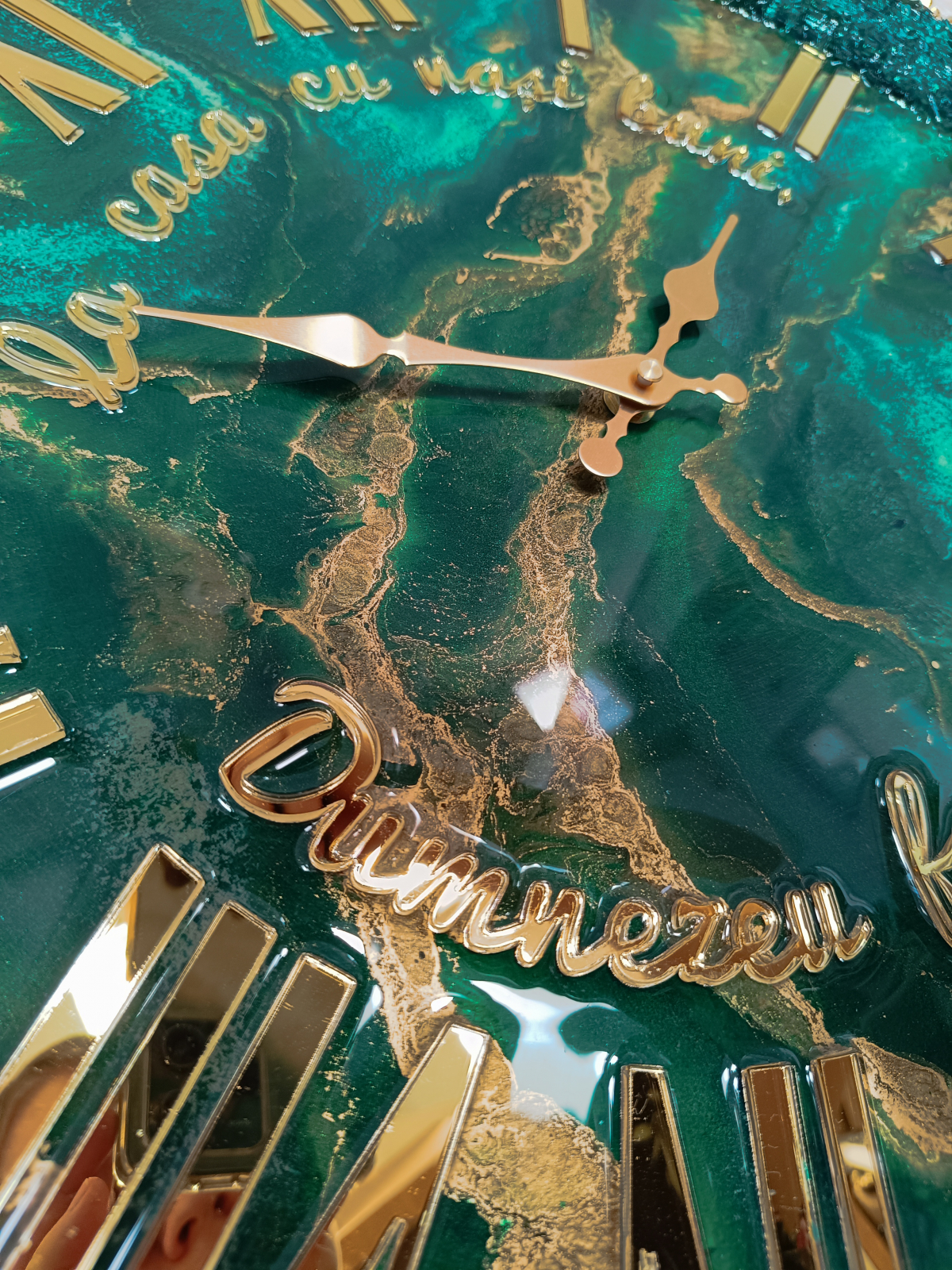 Ceas de perete handmade, lucrat manual din rășină epoxidică de calitate superioară, model Geode Marmorat în nuanțe vibrante de verde smarald - parte din colecția brandului Elegant Collections.