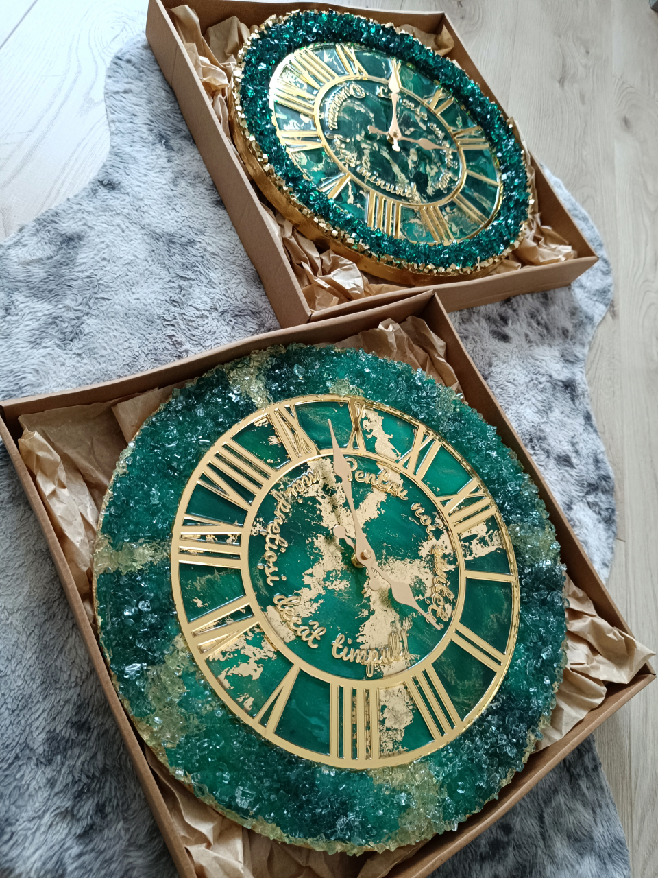 Cu mecanism silențios, detalii aurii aplicate manual și sistem de prindere inclus, ceasurile Marbled Geode Marmorat sunt adevărate opere de artă funcțională – ideale ca obiecte decorative elegante sau ca idei de cadou speciale, realizate manual în România, parte din colecția exclusivă E-Collections.