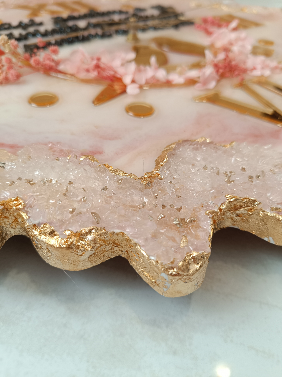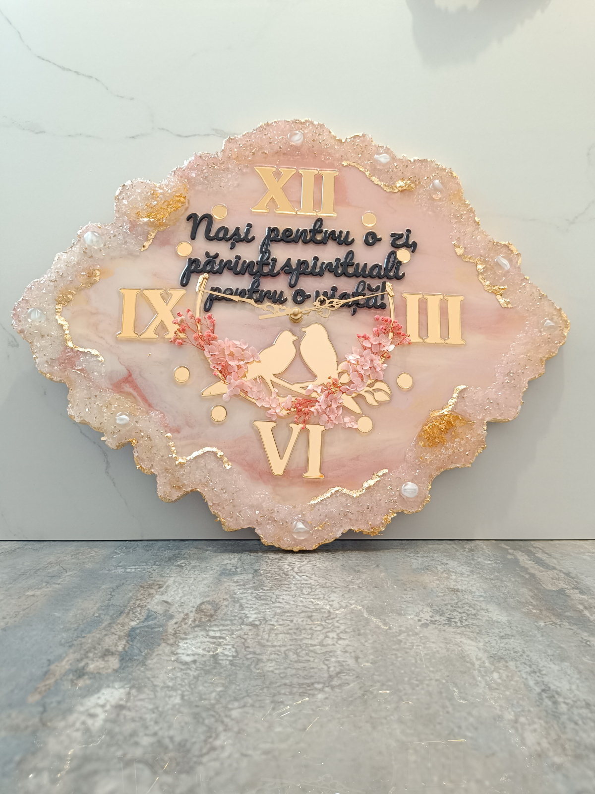 Adaugă un accent feminin și rafinat cu acest ceas de perete handmade din rășină epoxidică, model Bijoux Rombe. Designul delicat în nuanțe de roz pal este completat de accente aurii și textură tip diamant, oferind un efect decorativ elegant și luminos.
