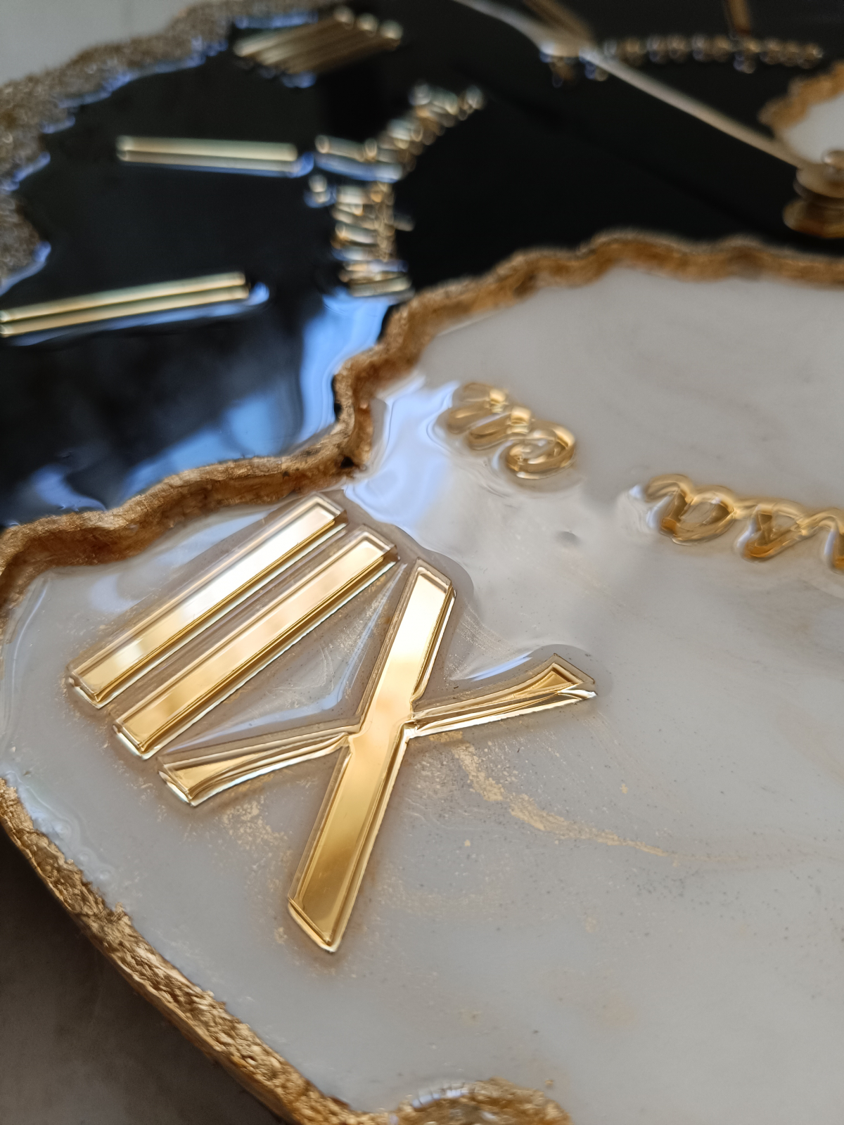 Ceas de perete handmade, din colecția Elegant Collections, este un produs artizanal din rășină epoxidică, cu design asimetric inspirat de forma unui fluture. Model unicat, în nuanțe elegante de negru și auriu, cu detalii decorative aplicate manual. Mecanism silențios, cifre aurii tip oglindă și sistem de prindere inclus. Ideal pentru decor modern, cadou special sau interioare elegante. Dimensiune: 45 cm.