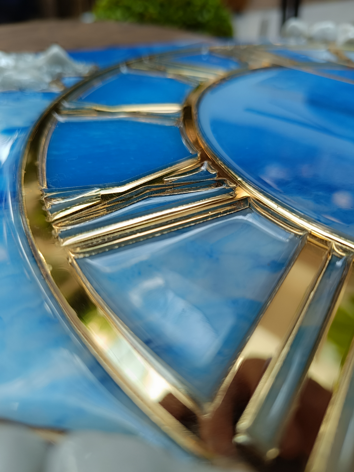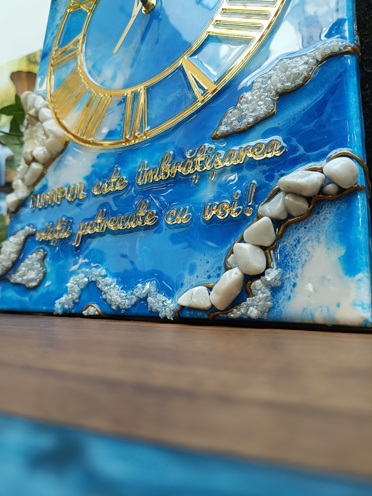 Adaugă prospețime și stil spațiului tău cu acest ceas de perete handmade realizat din rășină epoxidică, model Marbled Canvas Ocean Bleu Marin & Pietre Albe. Lucrat manual în România, acest ceas artizanal surprinde frumusețea adâncurilor marine prin tonuri de bleu marin intens, valuri translucide și pietre decorative albe aplicate manual.