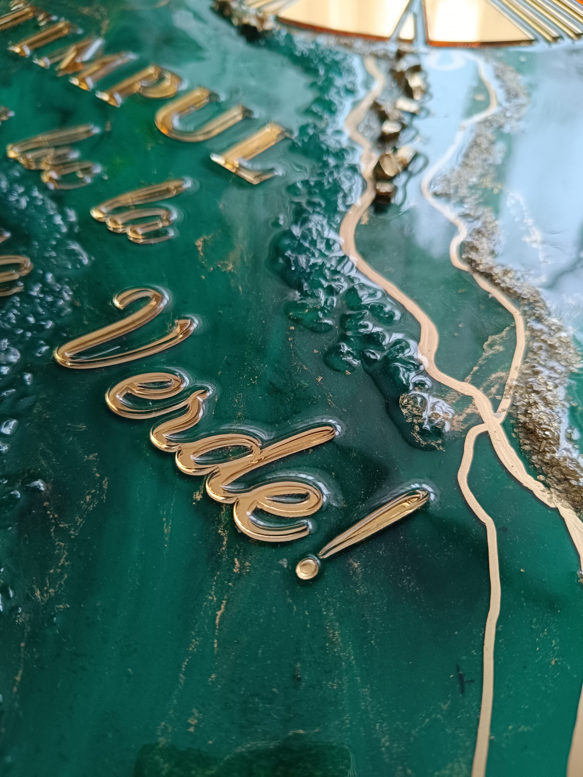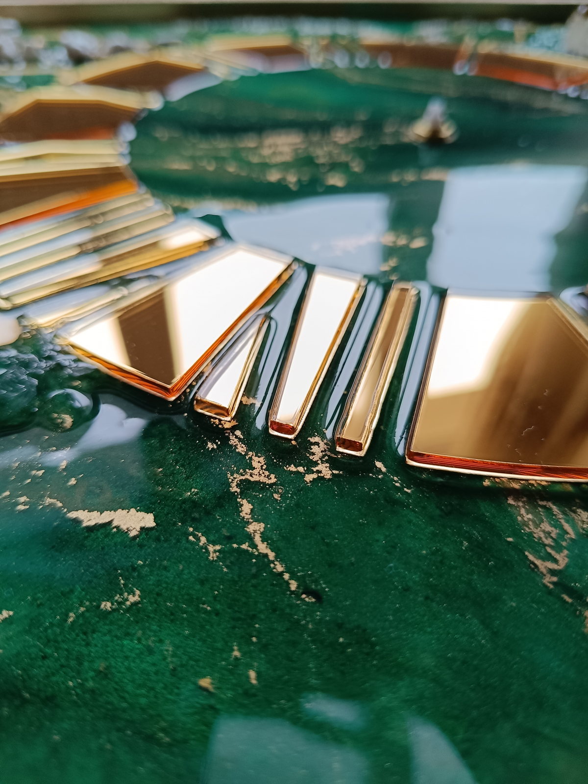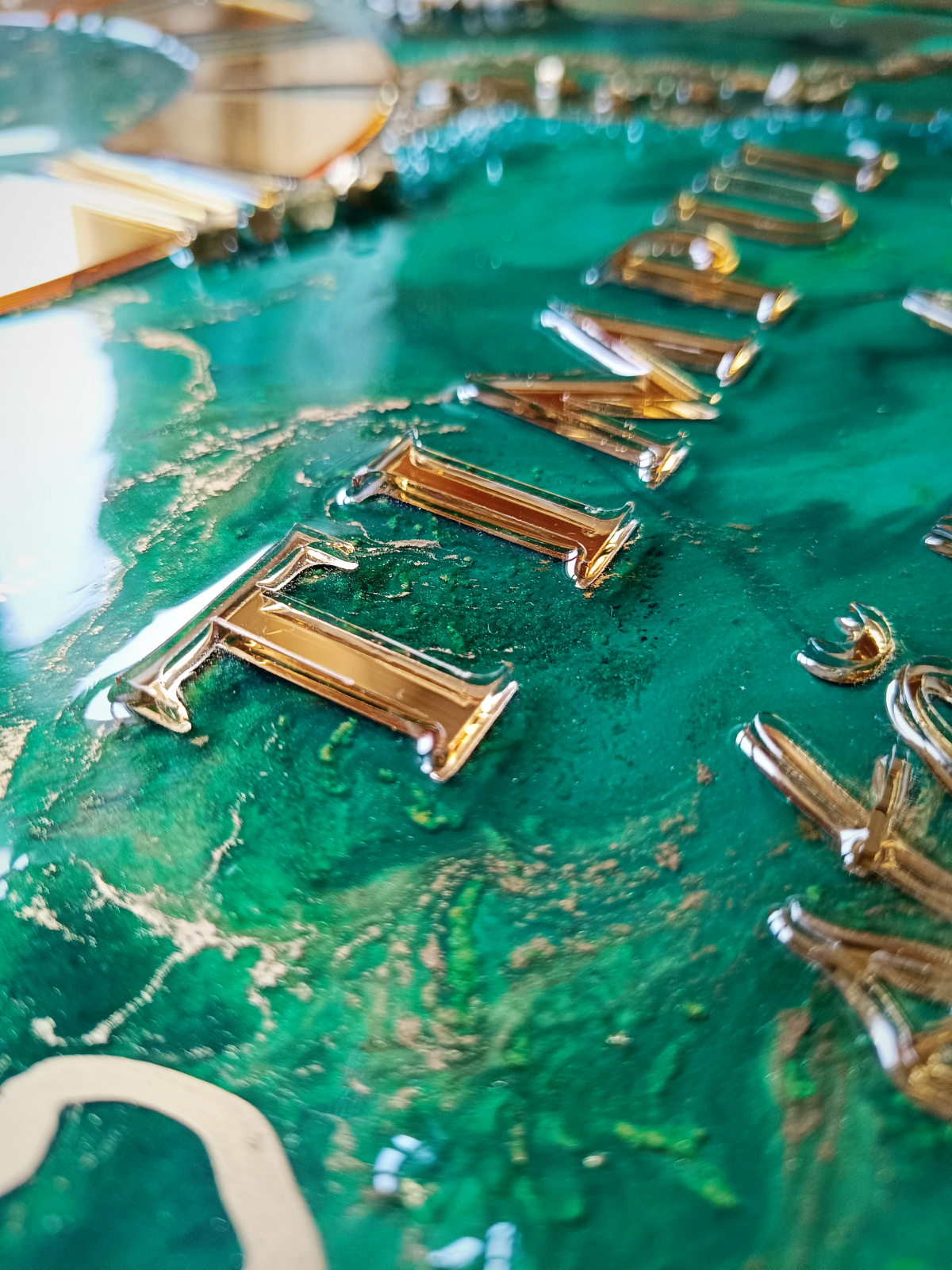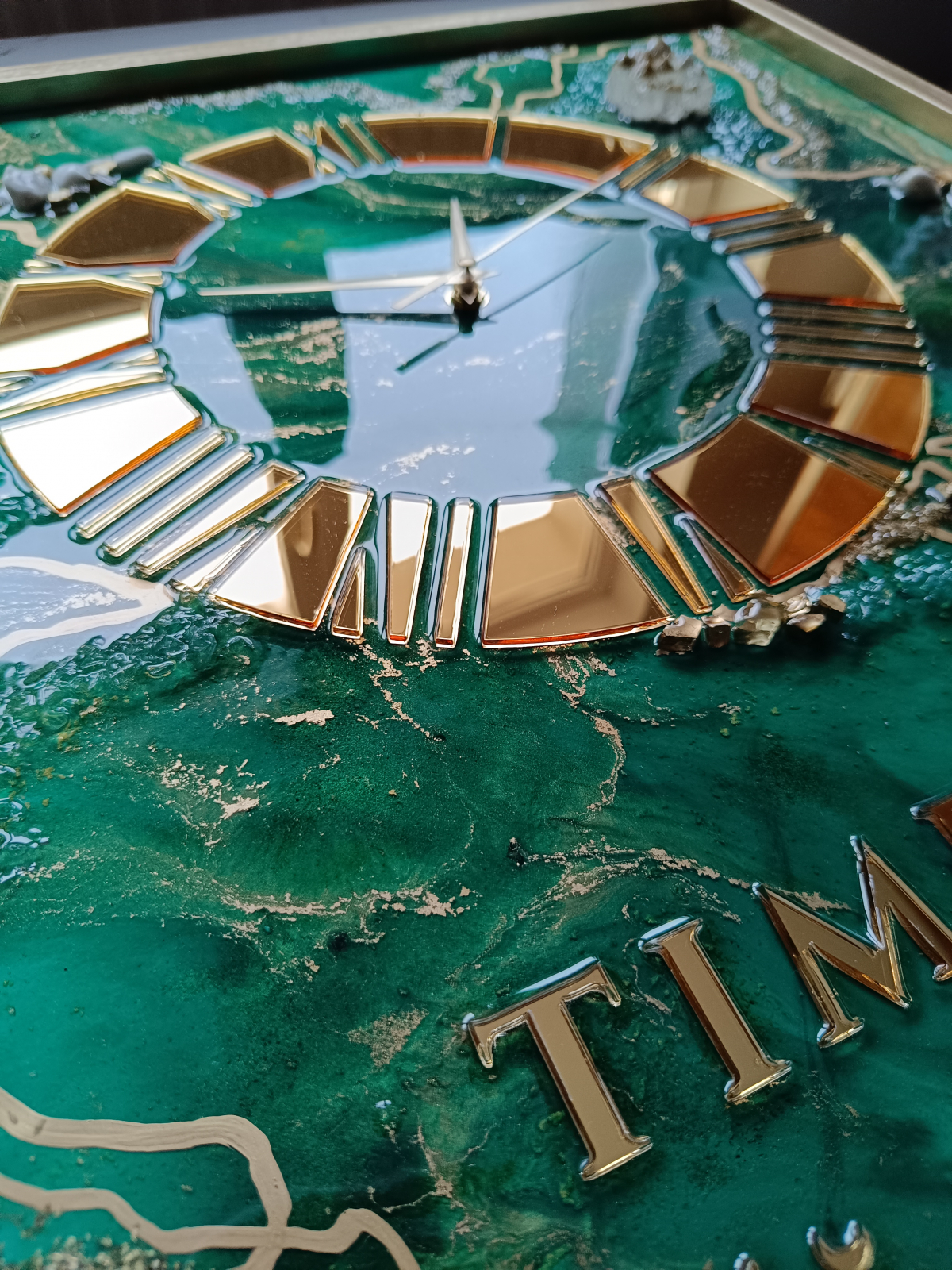 Ceas de perete handmade din rășină epoxidică – Marbled Canvas Verde Smarald Nature, unicat (30×40 cm / 50×70 cm)