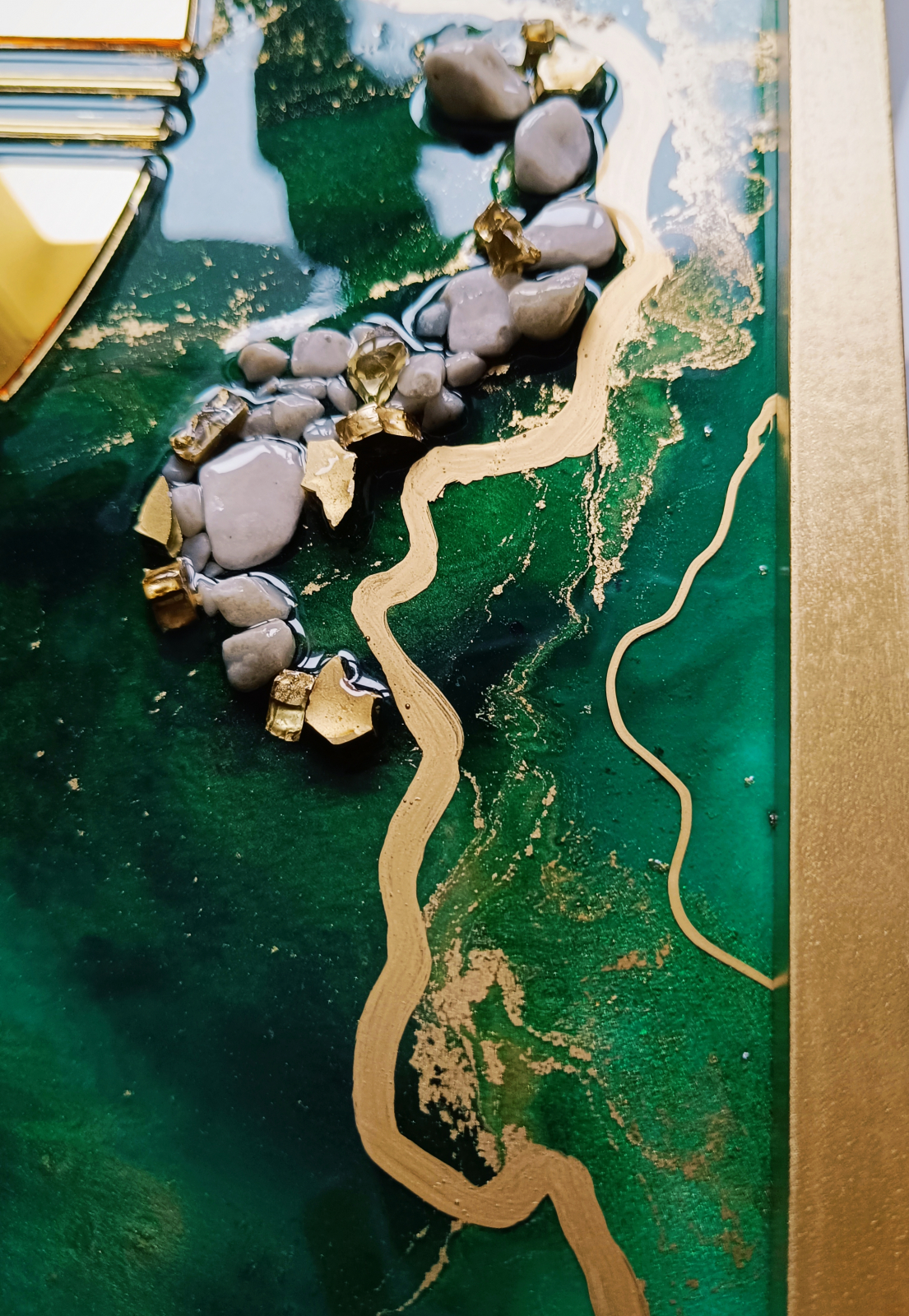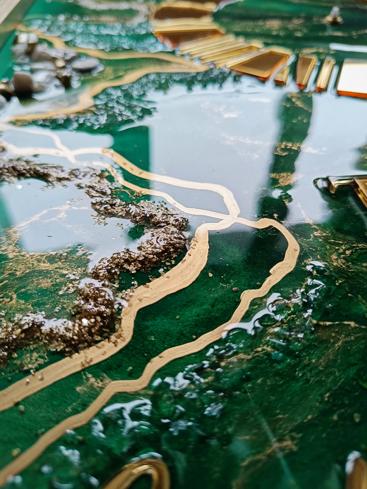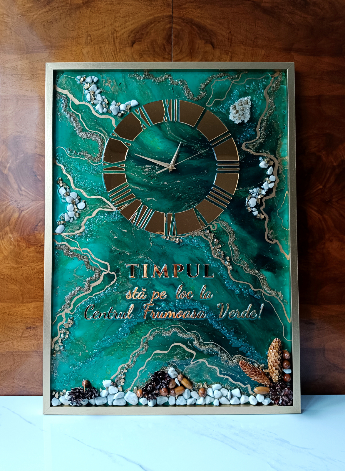 Ceas de perete handmade din rășină epoxidică – Marbled Canvas Verde Smarald Nature, unicat (30×40 cm / 50×70 cm), cu design artistic, accente naturale și mecanism silențios.