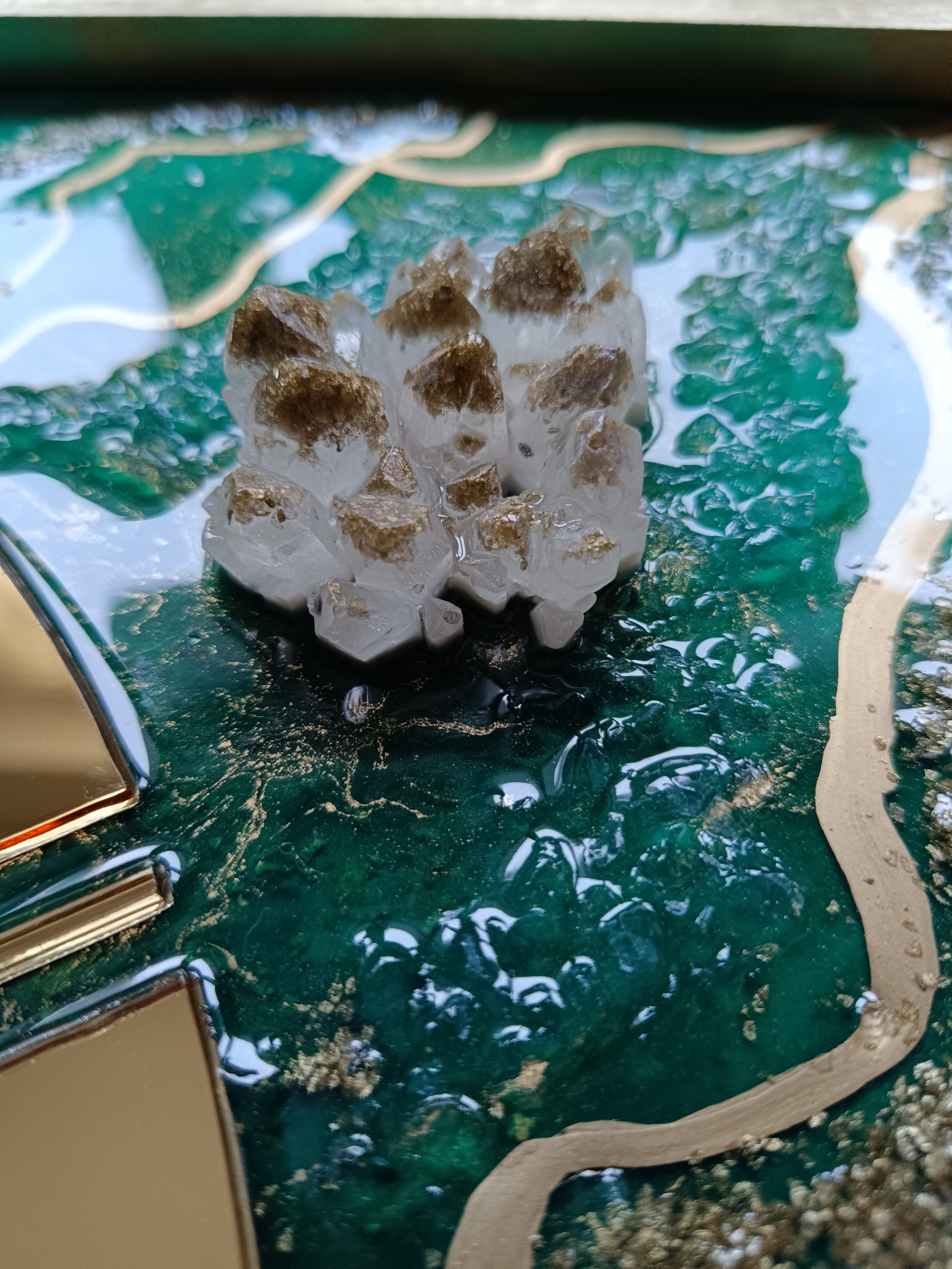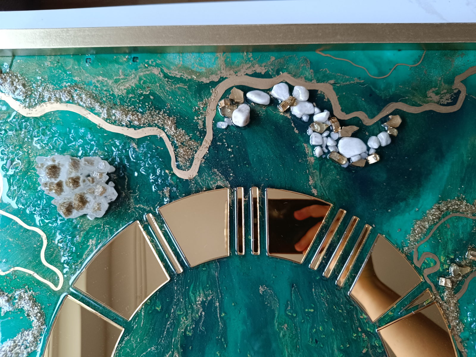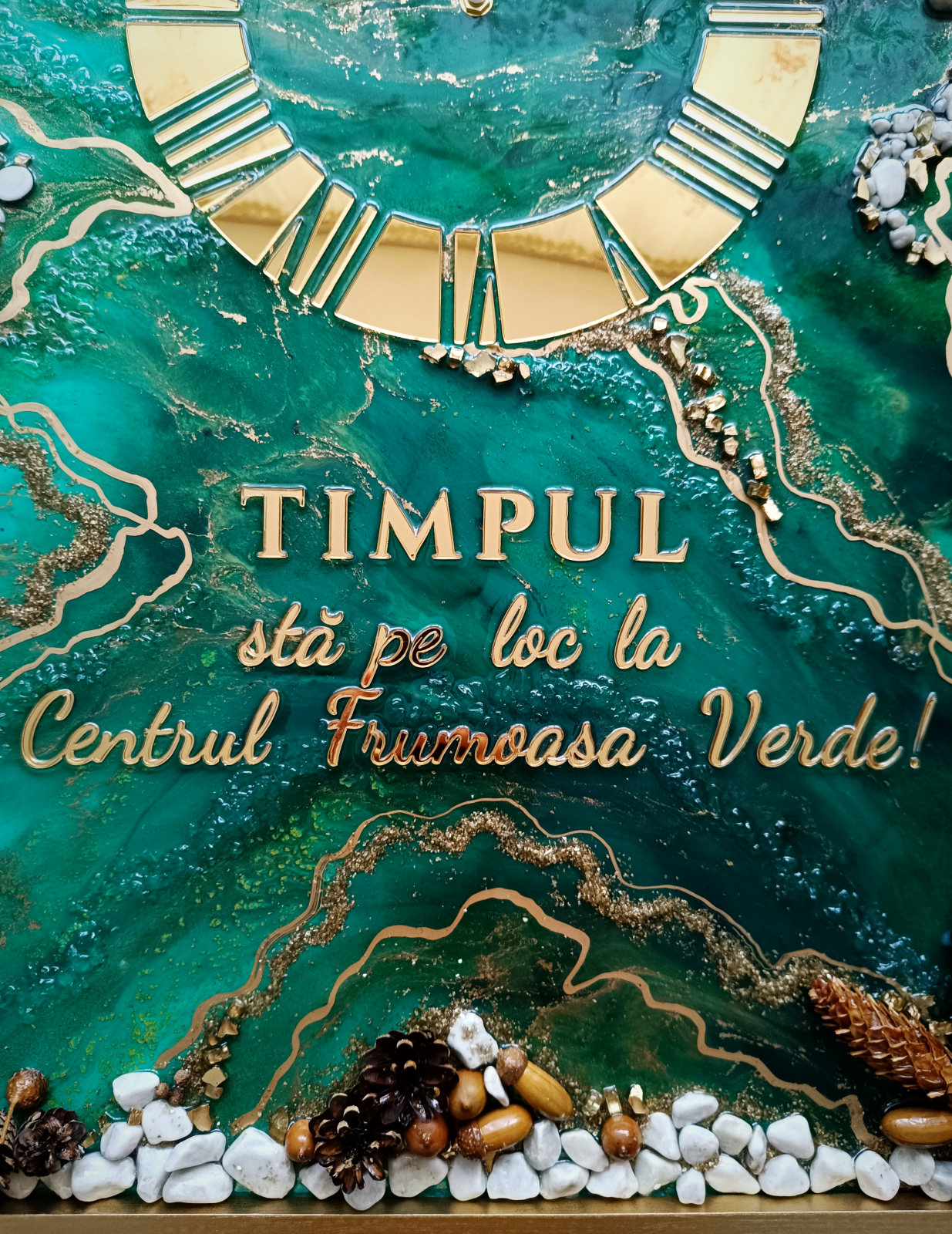 Ceas de perete handmade realizat din rășină epoxidică în tehnică Marbled Canvas, cu un design natural în nuanțe de verde smarald, alb translucid și accente inspirate din peisaje forestiere. Fiecare piesă este unicat, lucrată manual în România, cu o textură marcată de valuri și profunzime vizuală.