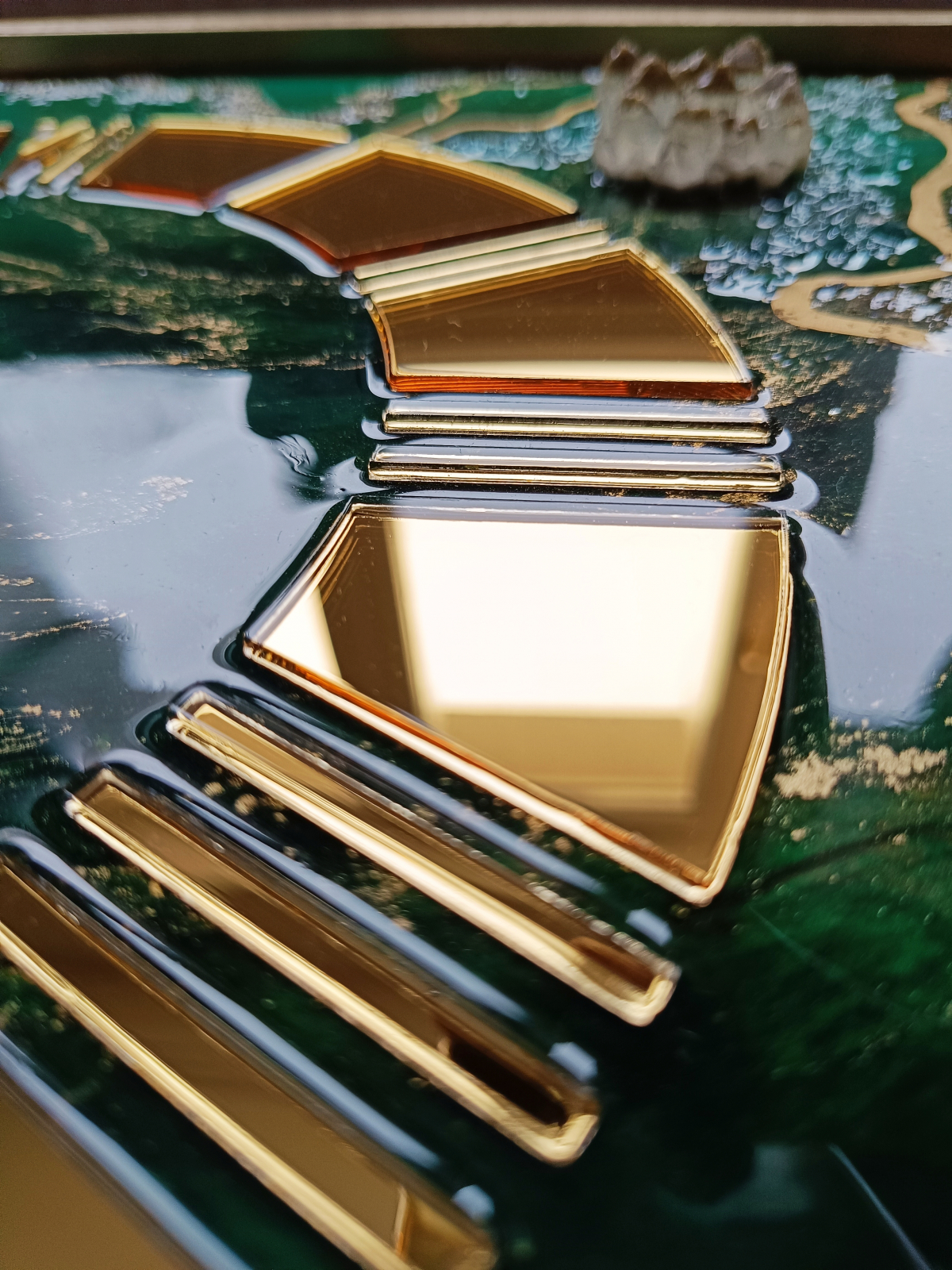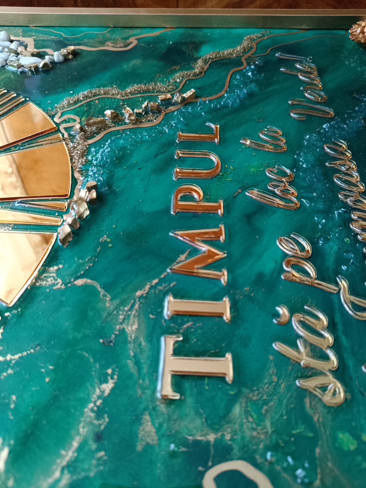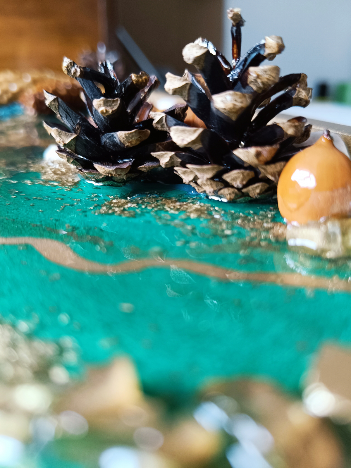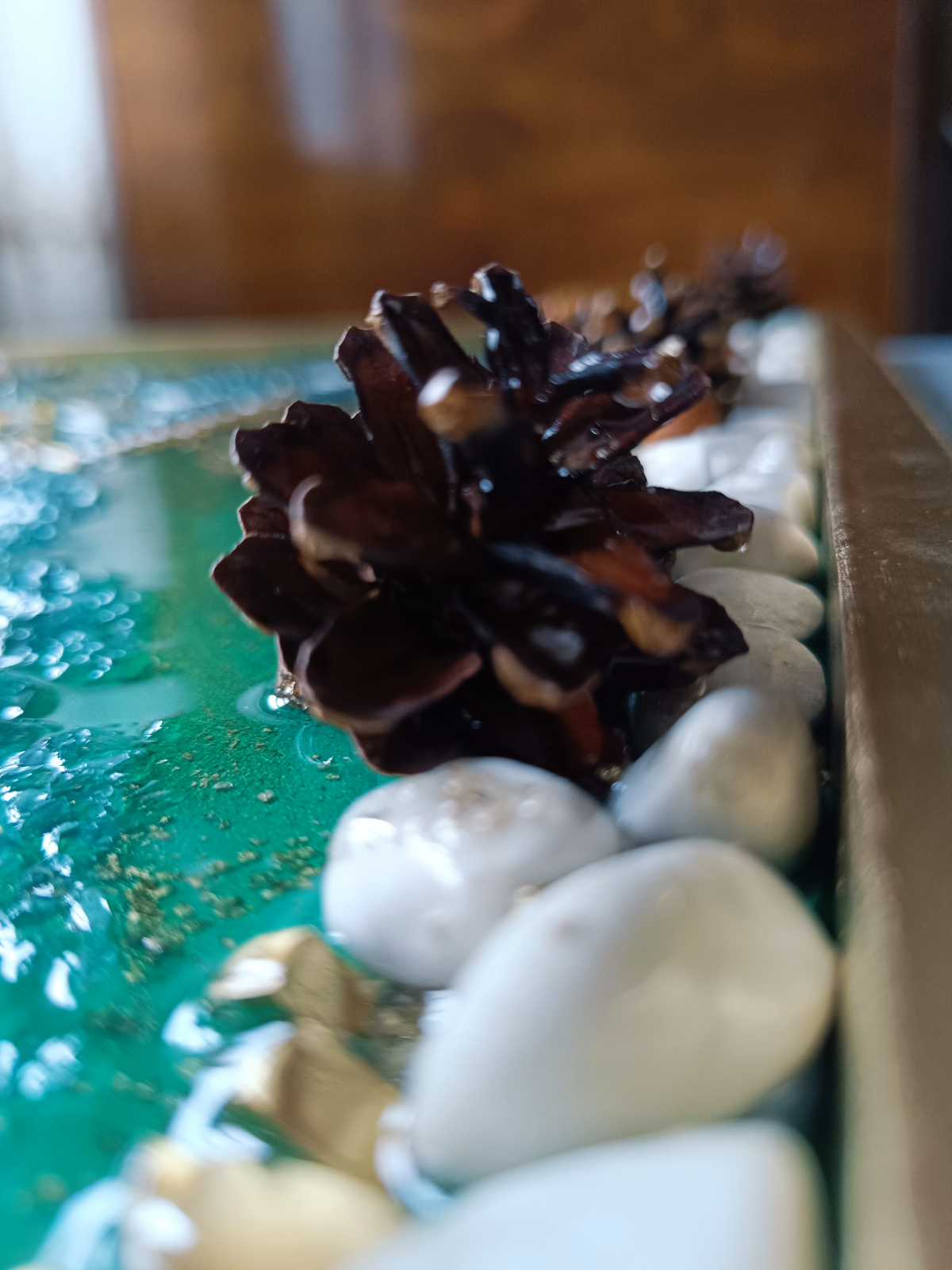 Ceas de perete handmade realizat din rășină epoxidică în tehnică Marbled Canvas, cu un design natural în nuanțe de verde smarald, alb translucid și accente inspirate din peisaje forestiere. Fiecare piesă este unicat, lucrată manual în România, cu o textură marcată de valuri și profunzime vizuală.