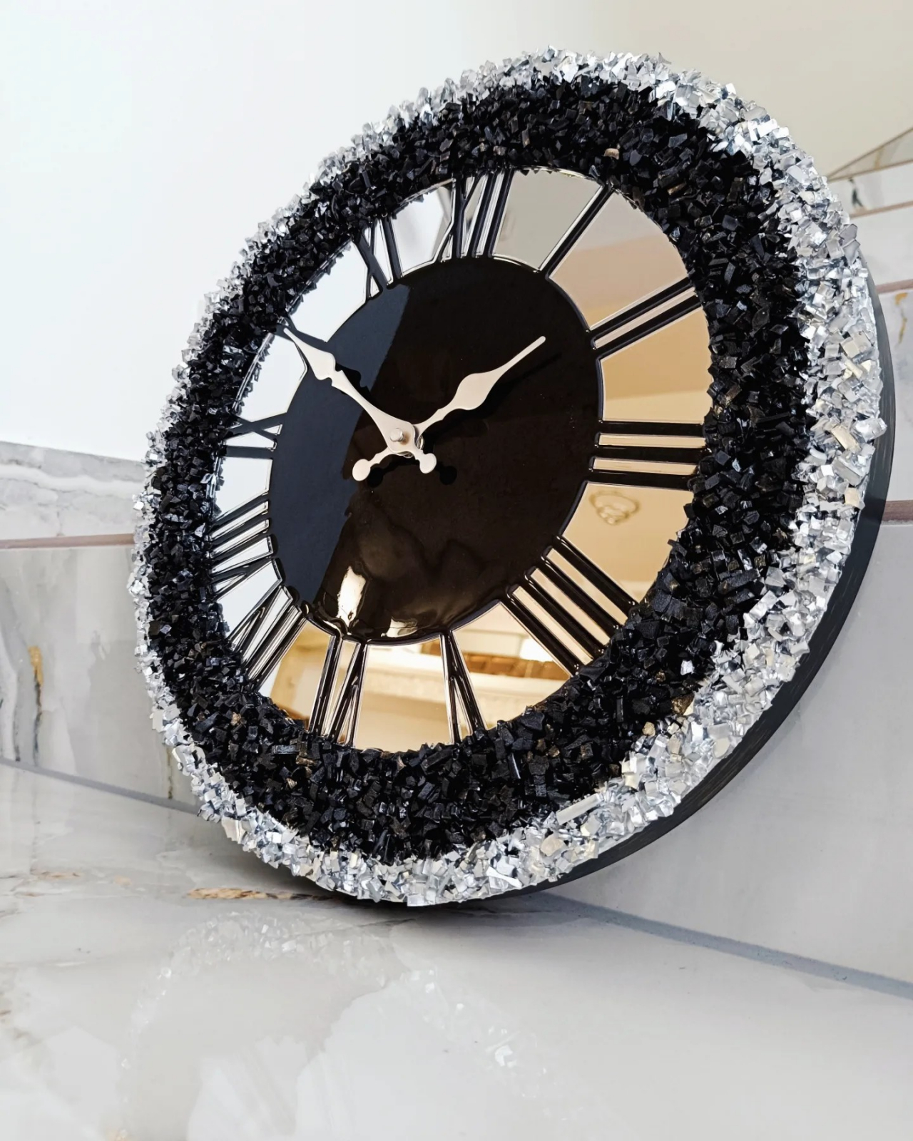 Ceas de perete handmade din rășină epoxidică – Geode Monocrom Negru Diamond, unicat (disponibil între 40 și 90 cm)