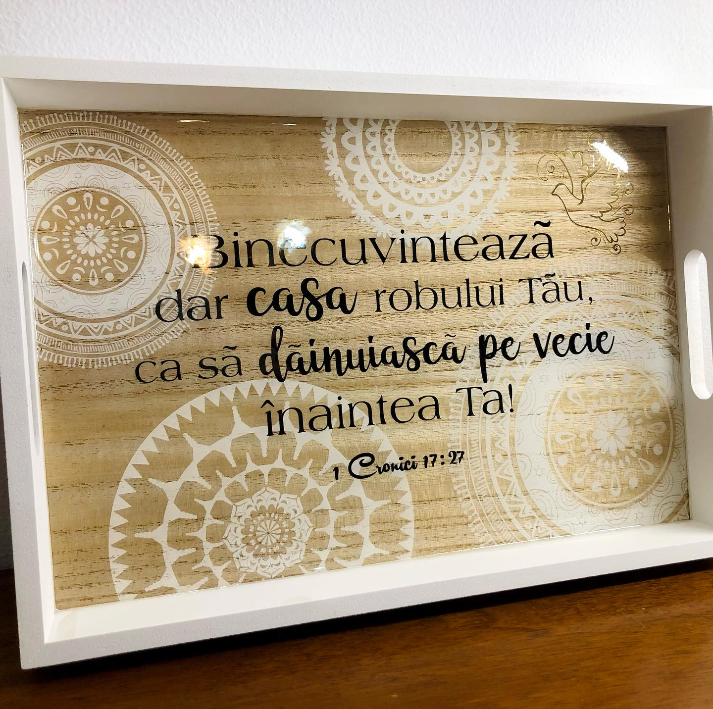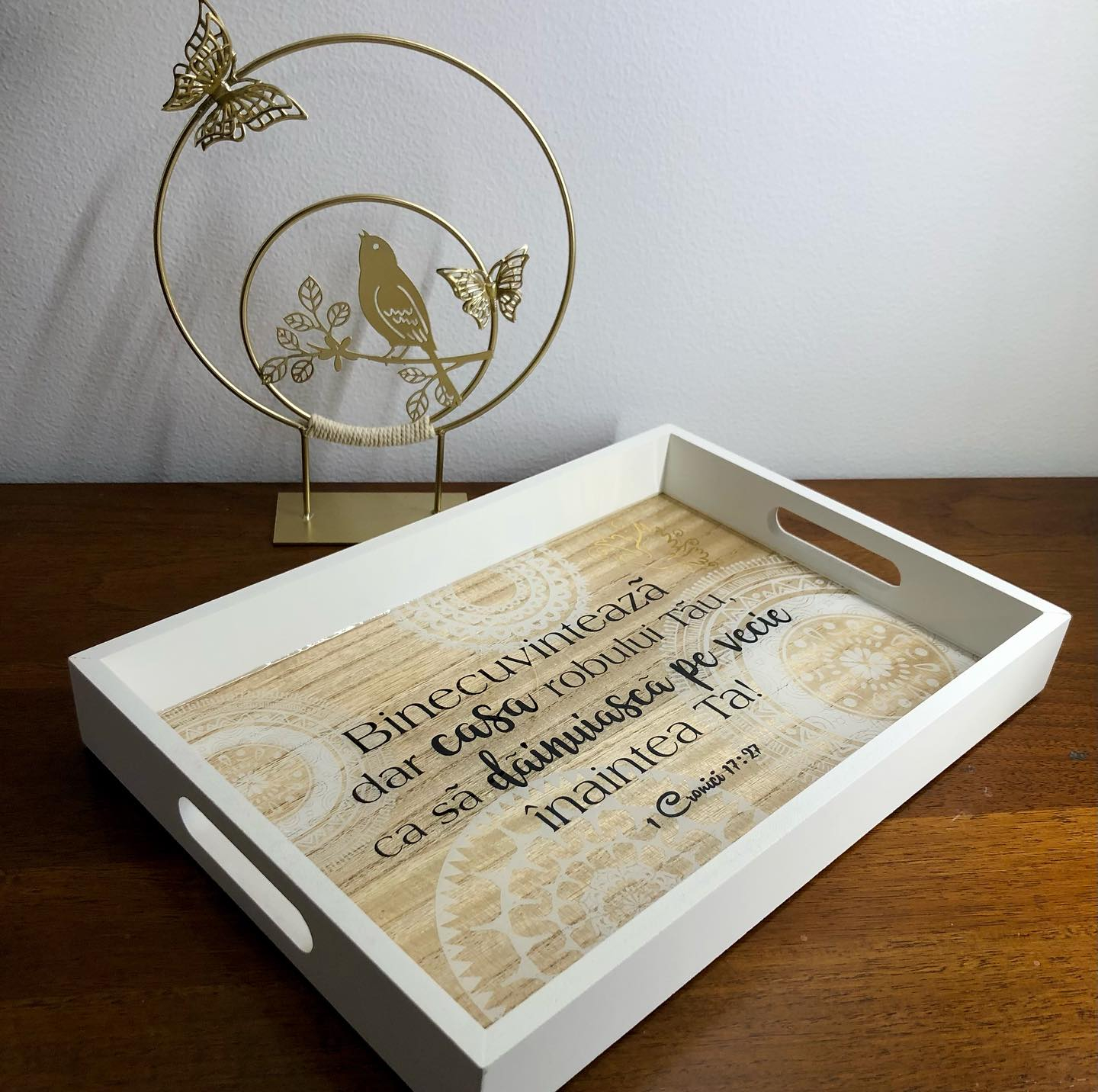 Îl poți folosi ca piesă decorativă pentru masă, comodă sau colțul preferat din casă. Dacă îți dorești, poate fi folosit și la servire: prăjituri, pahare, ceaiuri - totul capătă un farmec aparte.
